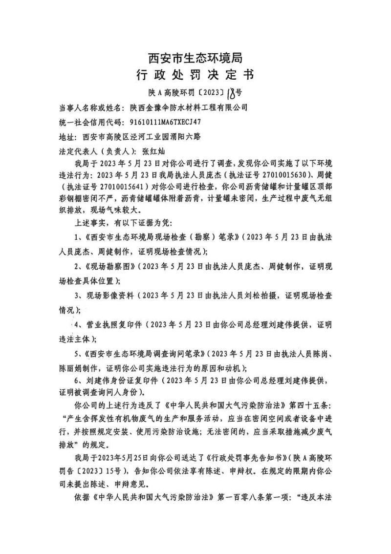 西安市生態環境局行政處罰決定書陜A高陵環罰〔2023〕18號