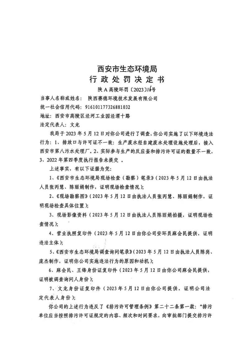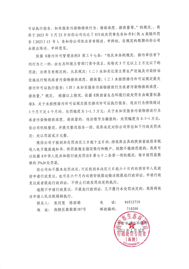 西安市生態(tài)環(huán)境局行政處罰決定書陜A高陵環(huán)罰〔2023〕16號(hào)