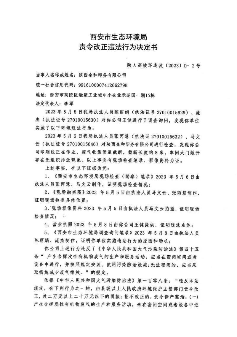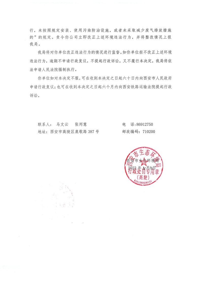 西安市生態環境局高陵分局責令改正違法行為決定書〔2023〕D-2