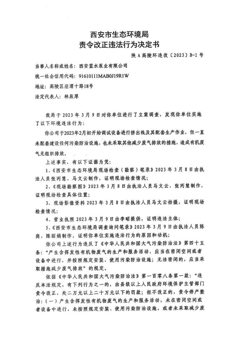 西安市生態(tài)環(huán)境局高陵分局責(zé)令改正違法行為決定書〔2023〕B-1 |