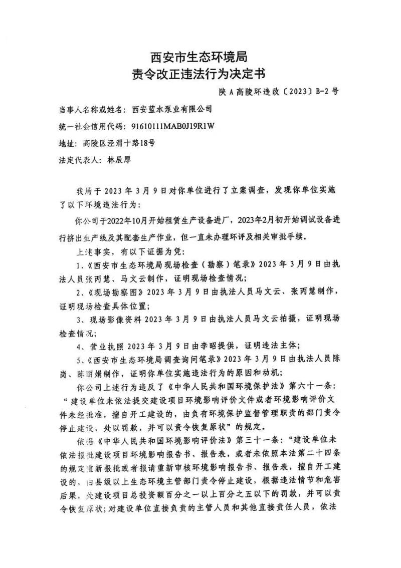 西安市生態環境局高陵分局責令改正違法行為決定書〔2023〕B-2