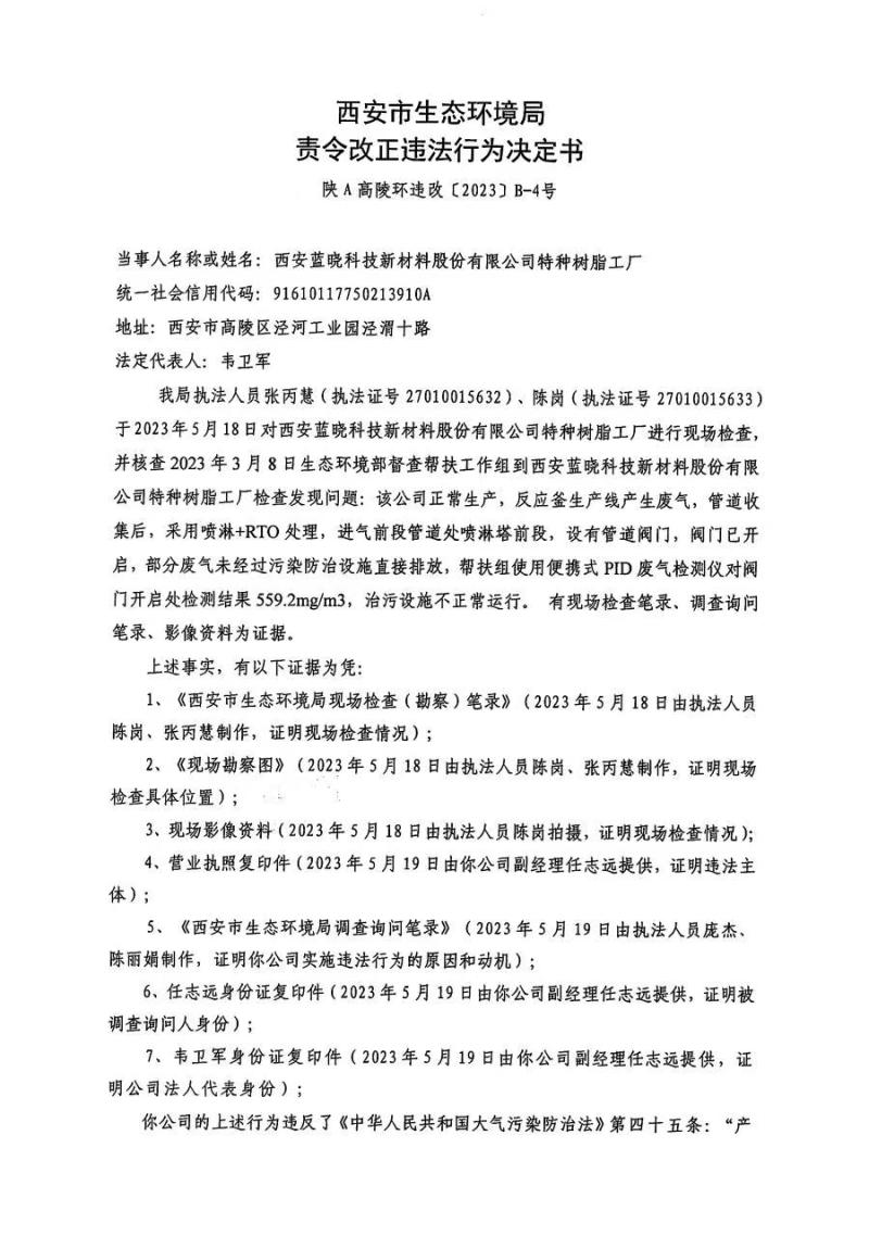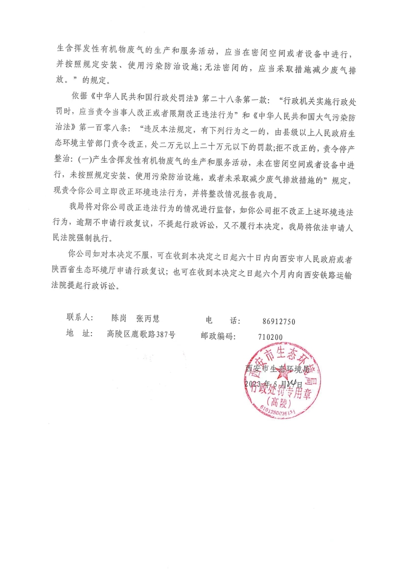 西安市生態環境局高陵分局責令改正違法行為決定書〔2023〕B-4號