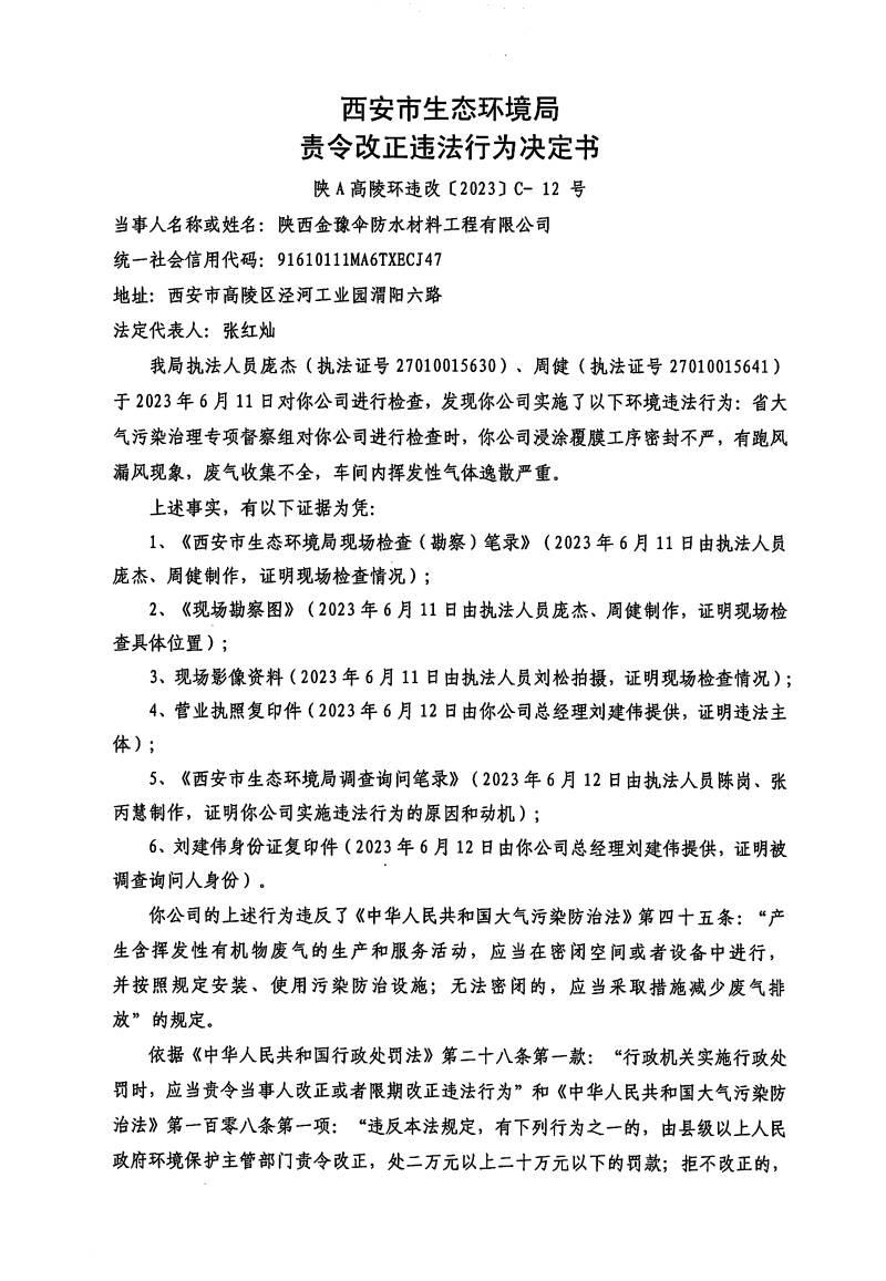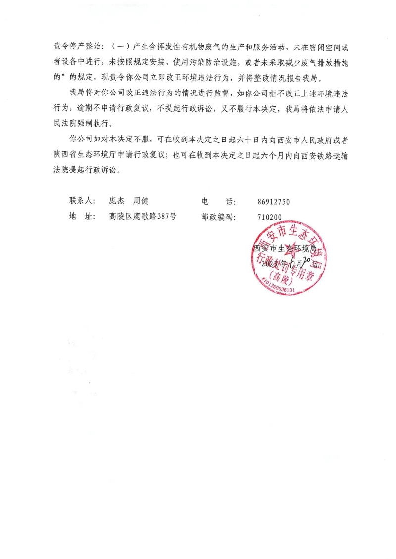 西安市生態環境局高陵分局責令改正違法行為決定書〔2023〕C-12