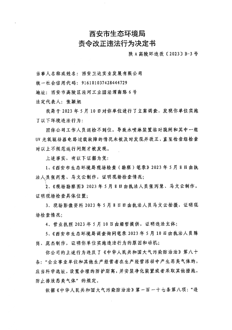 西安市生態(tài)環(huán)境局高陵分局責(zé)令改正違法行為決定書〔2023〕B-3 |