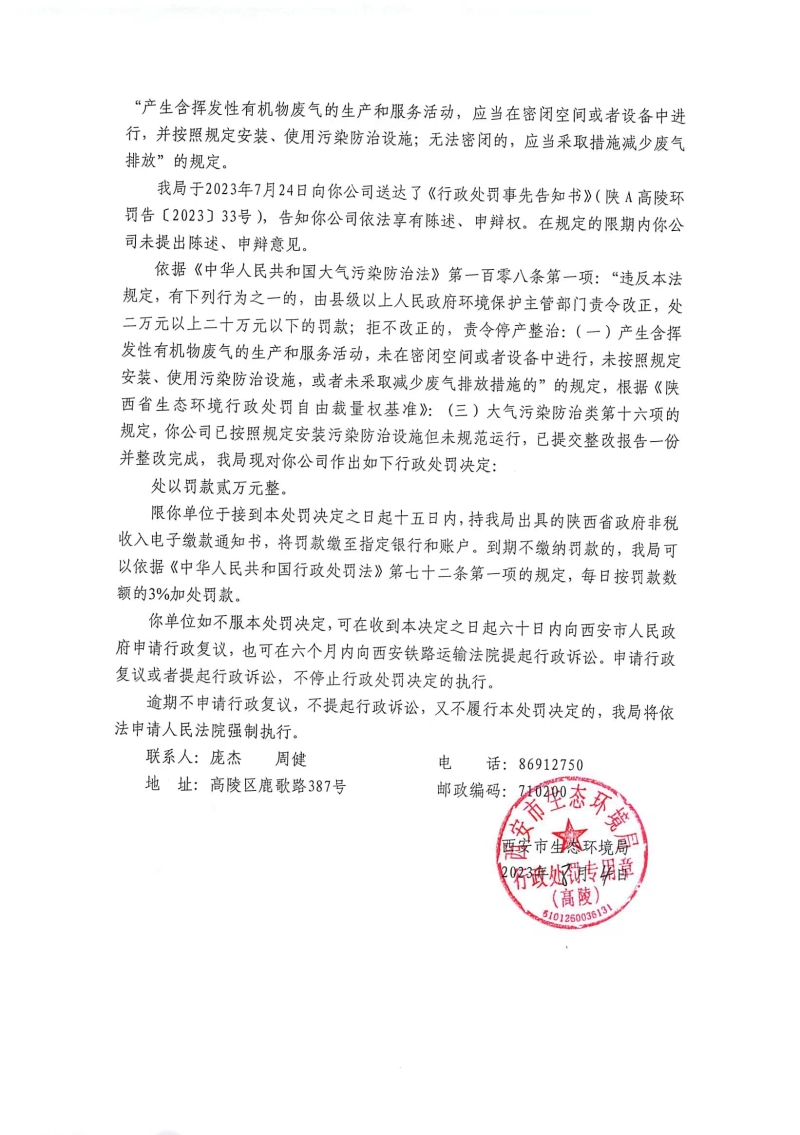 西安市生態環境局行政處罰決定書陜A高陵環罰〔2023〕32號