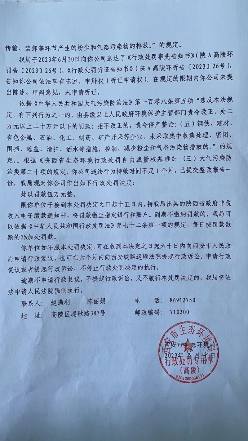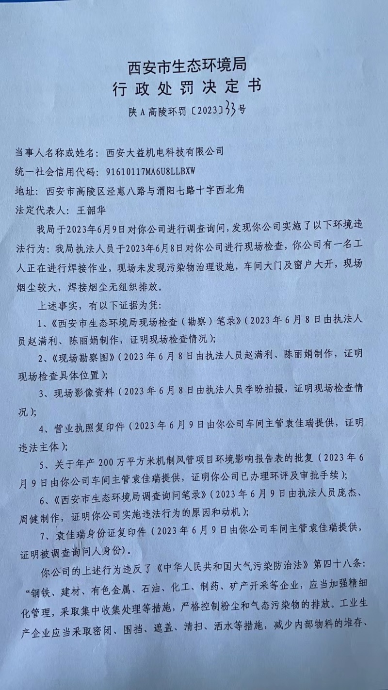西安市生態環境局行政處罰決定書陜A高陵環罰〔2023〕33號