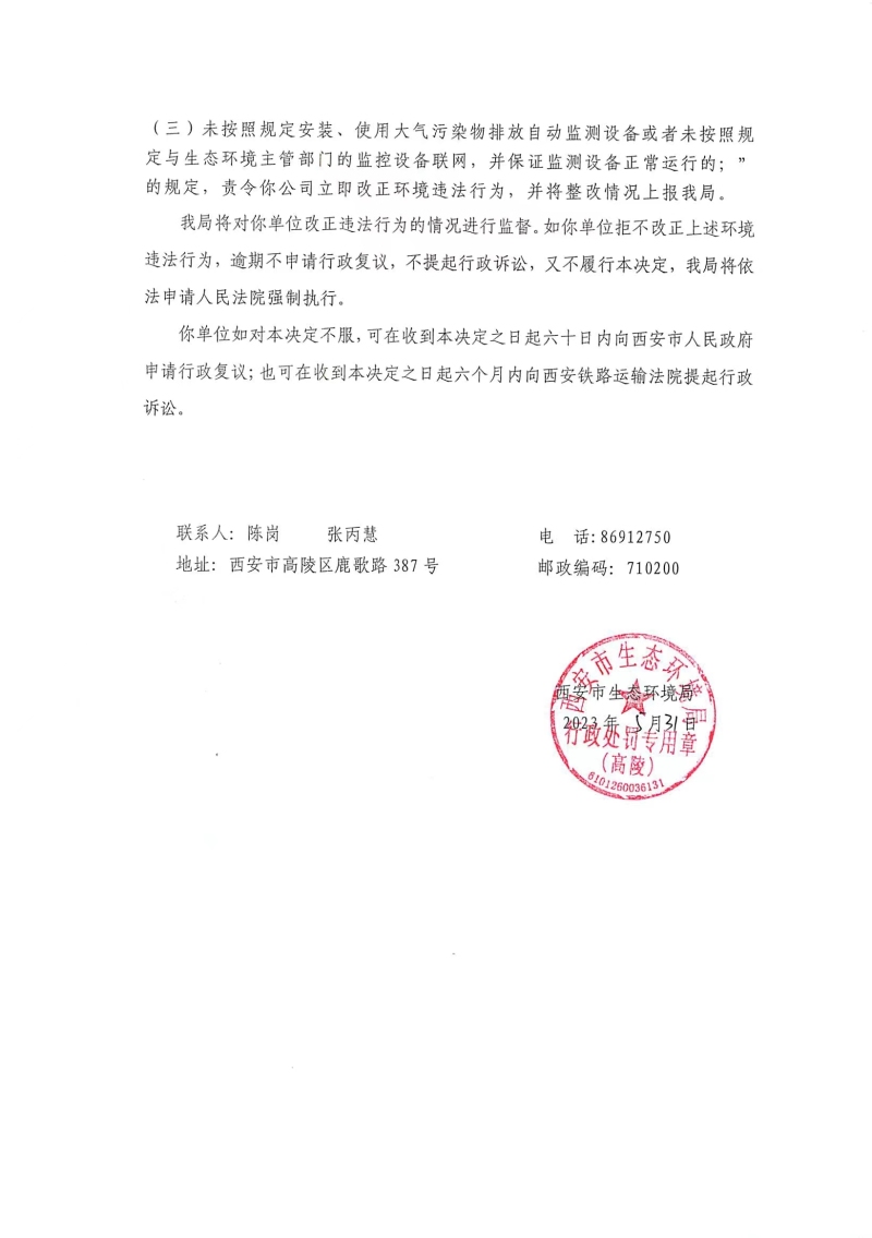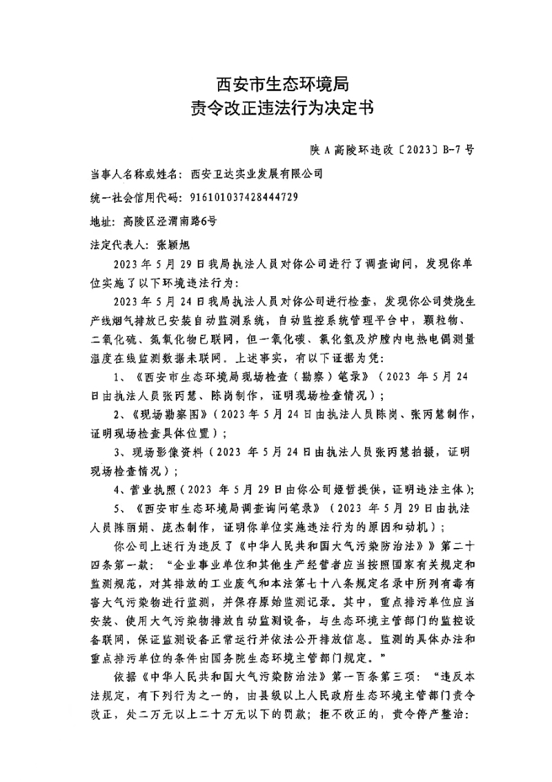 西安市生態環境局高陵分局責令改正違法行為決定書〔2022〕B-7