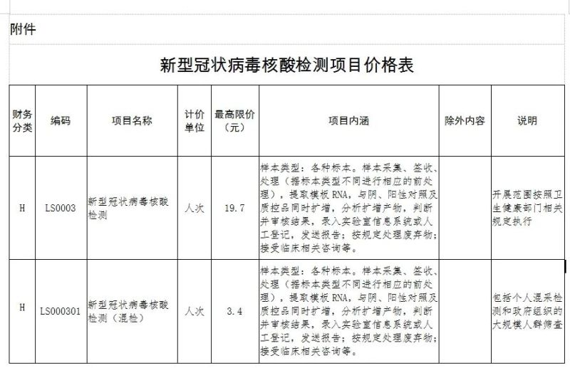 一、公立醫(yī)療機構按照衛(wèi)生健康部門診療規(guī)范開展的新型冠狀病毒核酸檢測單人單檢價格每人次最高限價為19.7元(含擴增試劑);多人混檢不分樣本數(shù)量,每人次最高限價為3.4元。