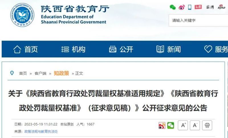 5月19日,陜西省教育廳印發(fā)《陜西省教育行政處罰裁量權(quán)基準(zhǔn)適用規(guī)定(征求意見稿)》。
