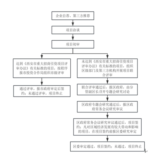 2.項目初審。由項目招商主體單位負責聯系相關職能單位對項目進行初步審核。審核內容包括:是否符合國家、省、市法律法規、產業政策、行業準入標準、生態環境分區管控等要求;是否符合安全、環保要求;是否符合園區產業定位;是否符合項目投資要求。同時,按照《西安市重大招商引資項目評審辦法》,滿足以下條件一項或多項的,應委托第三方開展法律及財務盡職調查并在區級初審通過后,由區投資合作局報市投資合作局申請組織市級評審,形成評審結果報市政府審定:(1)總投資30億元以上制造業項目;(2)合同外資1億美元以上制造業項目;(3)總用地300畝以上的項目;(4)引進各類支持政策2億元以上的制造業項目;(5)確需評審的其他招商引資項目。