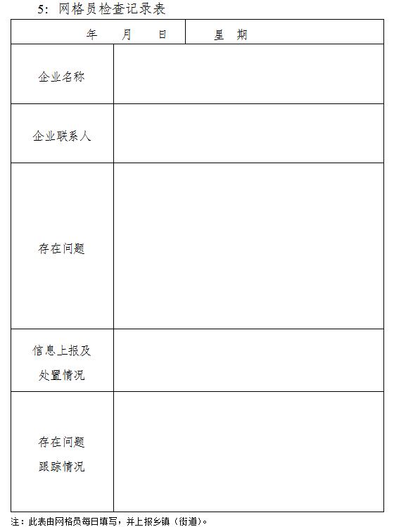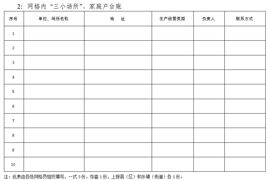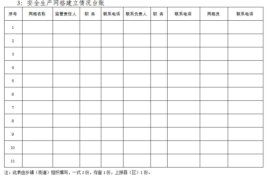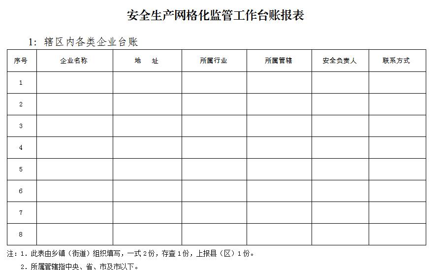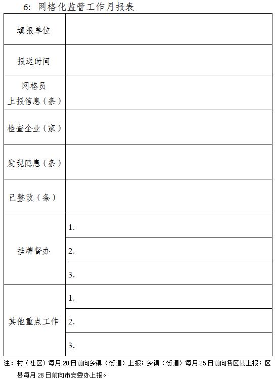各網格主管單位、各街辦要按照實施方案的要求,完成網格劃分,力量整合,落實網格區域范圍、網格責任人,確定各個網格、責任人的安全監管職責與任務。要建立安全生產網格化監管工作的“三臺賬三報表”,即轄區內各類企業臺賬、網格內“三小場所”及家庭戶臺賬、安全生產網格建立情況臺賬、網格員當日工作情況統計表、網格員檢查記錄表、網格化監管工作月報表。(見附件2)
